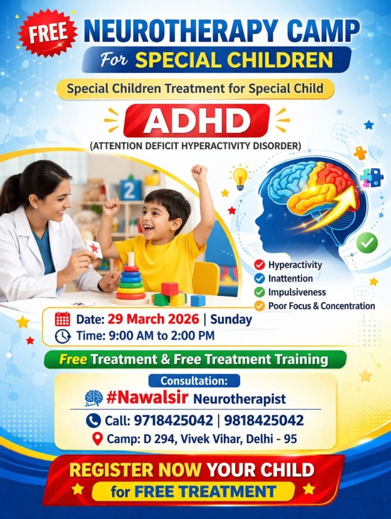 निराशा में आशा की एक किरण है “न्यूरोथैरेपी ” #ADHDनिशुल्क न्यूरोथैरेपी उपचार कैम्प, आपके विशेष बच्चों के लिएदिनांक : 29 मार्च 2026 | दिन रविवार प्रातः 9am to 2pm Free Neurotherapy Camp for Special Childrenन्यूरोथैरेपी का विशेष इलाज, आपके विशेष बच्चों के लिए सीखें delayspeech #delaydevelopment #delaygrowth #DelayedMilestones #delaymentaldevelopment autism #cerebralpasy #hyperactivity #cpchild अगर आप…